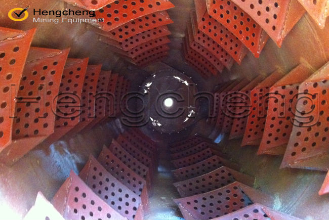 圓/滾筒洗礦機利用旋轉的圓筒和內部的刮板以及物料中自有的卵石和巖石來分解粘土,塊狀物和軟質物。洗礦機的圓筒慢慢地旋轉,粗細不同的物料還有水同時在一起翻滾攪動,有效地把有用礦物從泥性土壤,粘土中分離出來。分散均勻后漿狀般的物料被圓筒送到尾端,并從溢流口排到錐形篩進行篩分。錐形篩把大于有用礦物的粒度的物料排除,篩下的礦漿即可直接進入各種各樣的選礦設備,如離心選礦機、螺旋溜槽、跳汰機、不板溜槽等。